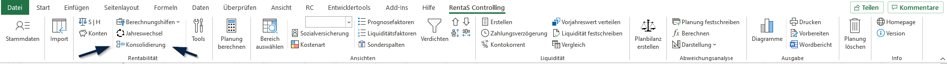 Die Konsollidierungsfunktion erreichen Sie wie unten in der Grafik dargestellt, über das Hauptmenü RentaS Planung.
